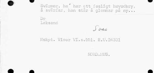 //// Svärmor, ho ' har ett fasligt huvudbry, å svärfar., han står å glommar på ny... //// Dr //// Leksand //// J O^uc //// Mskpt. Visor VI.s.551. E.U.24331 //// NORD.MUS. ////