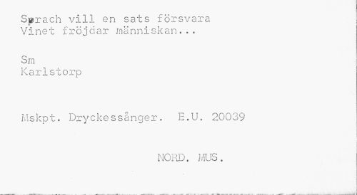 //// Sprach vill en sats försvara Vinet fröjdar människan... //// Sm //// Karlstorp //// Mskpt. Dryckessånger. E.U. 20039 //// 1 //// NORD. MUS. ////