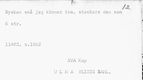 //// / //// Syskon små jag känner fem, stackars den som //// ¦ //// 6 str. //// 11482, s. 1062 //// SVA Kop //// U L M A BLIXTS 3AML. j ////