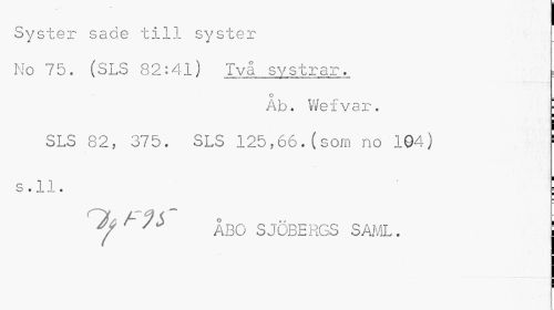 //// I //// Syster sade till syster //// No 75. (SLS 82:41) Två systrar. //// o //// Ab. V/ef var. ¦ //// i //// SLS 82, 375. SLS 125,66. (sorn no 104) ' //// s.ii. : //// ¦ //// y ^ ^ ÅBO SJÖBERGS SAML. ////