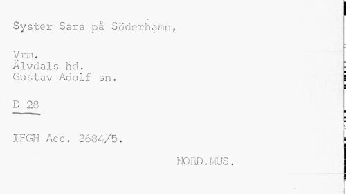 //// Syster Sara på Söderhamn, //// Vrm. ~ //// «* = //// Älvdals hd. ; //// Gustav Adolf sn. É //// D 28 //// IFGH Acc. 3684/5. t //// NORD.MUS. j //// t ////