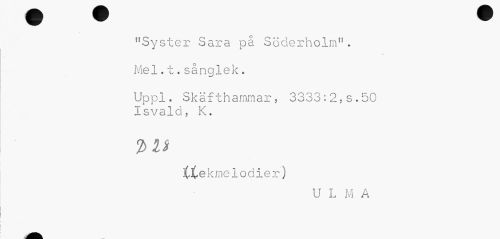 //// "Syster Sara på Söderholm". Mel.t.sånglek. //// Uppl. Skafthammar, 3333:2.s.50 Isvald, K. //// ttekrnelodier) //// U L M A ////