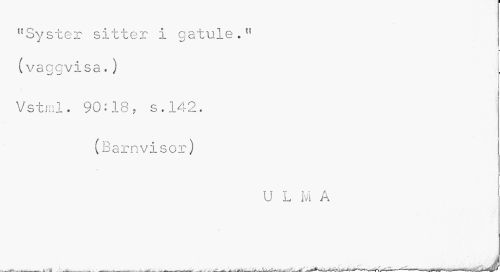 //// "Syster sitter i gatule." //// (vaggvisa.) ! //// Vstml. 90:18, s.142. //// (Barnvisor) //// U L M A ////