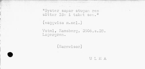 //// "Syster sopar stugan ren sätter löv i taket sen." //// (vaggvisa m.mel.) //// Vstml, Ramsberg, 3906,s.28. Lagergren. //// W W //// (Barnvisor) //// ^ U L M A ////