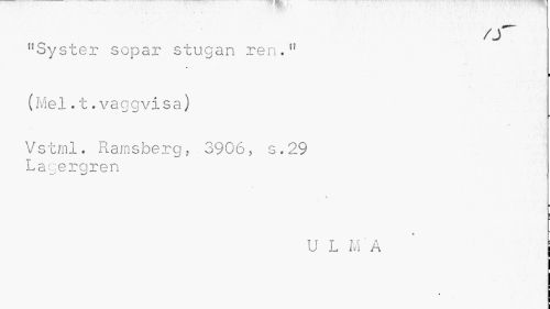 //// /J //// "Syster sopar stugan ren." //// I //// (Mel.t.vaggvisa) //// , a ¦ //// Vstml. Ramsberg, 3906 , s.29 Lacerqren //// \ //// ¦ //// ¦ //// U L MÅ | ////