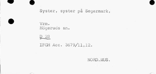 //// Syster, syster på Segermark, //// ^ Vrm. //// Högeruds sn. //// D 28 //// IFGH Acc. 3679/11,12. //// NORD.MUS. //// /---x ////