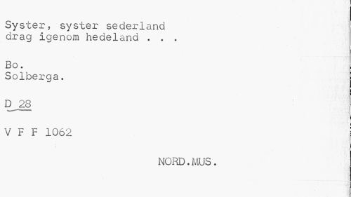 //// Syster, syster sederland drag igenom hedeland ... //// Bo. //// Solberga. //// D 28 //// | //// V F F 1062 //// NORD. MUS. //// / //// ¦ ////