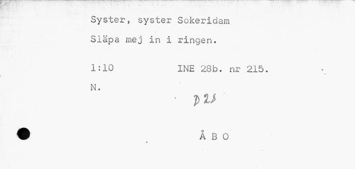 //// Syster, syster Sokeridam Släpa mej in i ringen. //// 1:10 INE 28b. nr 215. //// N. //// • )W //// i ^B ////