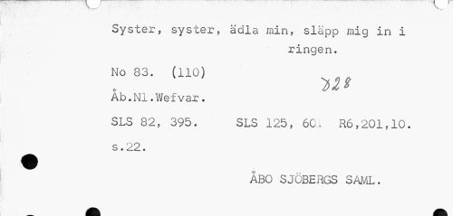 //// Syster, syster, ädla min, släpp mig in i //// ringen. //// No 33. (110) Åb.Nl.Wefvar. //// SLS 82, 395. SLS 125, 60. R6,201,10. s • • //// ^ ÅBO SJÖBERGS SAML. ////