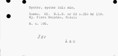 //// Syster, syster ädla min, //// Ä Ramsa. Hl. S.L.S. nr 82 s.253 Nr 119. //// W Sj. Flora Holsten, Rosala //// N. s. 395. //// Ull? //// ÅBO //// v ////
