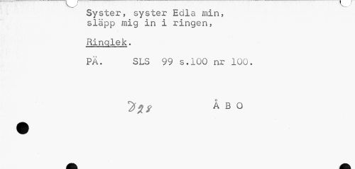 //// Syster, syster Edla min, släpp mig in i ringen, //// Ringlek. //// PÄ. SLS 99 s.100 nr 100. //// ÅBO ////