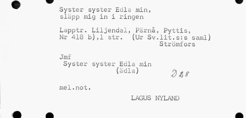 //// ^ Syster syster hdla min, //// släpp mig in i ringen //// Lapptr. Liljendal, Pärnå, Pyttis, Nr 418 b),1 str. (Ur Sv.lit.s:s saml) //// Strömfors //// Jmf //// Syster syster Edl a mi n //// (ädla) 2)*,* //// mel.not. //// LAGUS NYLAND //// m 1 É fc i k ////