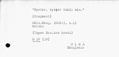 //// "Syster, syster ädela min." (fragment) //// Hals.Skog, 2065:1, s.ll Nordin //// (Typen Bro,bro breda) D 28 (29) //// ^^ Sånglekar ////