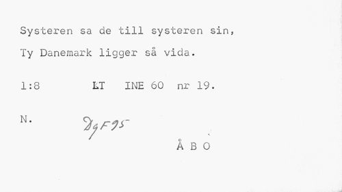 //// Systeren sa de till systeren sin, Ty Danemark ligger sä vida. //// 1:8 LT INE 60 nr 19. //// Å BO ////