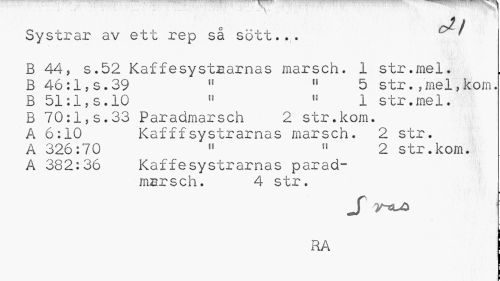 //// (J / //// Systrar av ett rep sa sött... ' //// B 44, s.52 Kaffesystrarnas marsch. 1 str.mel. j. B 46:1, s.39 11 n 5 strmel,kom. //// B 51:1,s.10 " " 1 str.mel. //// B 70:1,s.33 Paradmarsch 2 str.kom. A 6:10 Kafffsystrarnas marsch. 2 str. //// A 326:70 « » 2 str.kom. //// A 382:36 Kaffesystrarnas paradmarsch. 4 str. //// S V^A //// RA ////