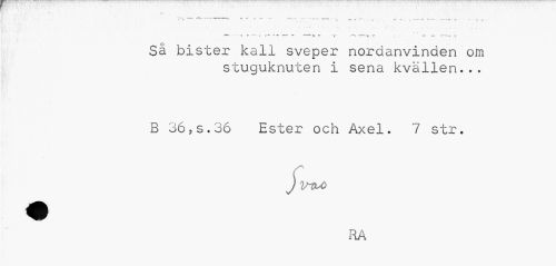 //// » f-*' //// V .. * • • •... «—, s v>< . • -. ^ . , -.t- -, •... n-... - - - //// • r , . //// T 7 % i" Ä ** * ** «% *rr /^V ^ «%¦* f—- as. -t- //// Sä bister kall sveper nordanvinden om //// stuguknuten I sena kvällen... //// B 36,s.36 Ester och Axel. 7 str. //// RA ////