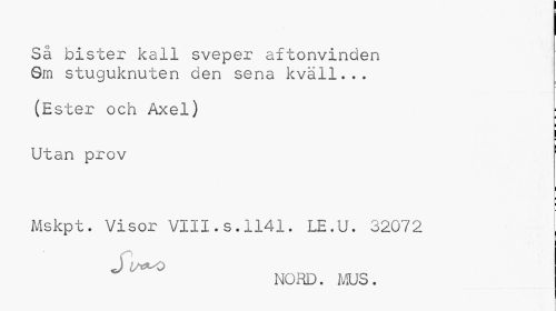 //// Sä bister kall sveper a ftonvinden Qm stuguknuten den sena kväll... //// (Ester och Axel) : //// i //// I //// Utan prov 1 //// i //// Mskpt. Visor VIII.s.1141. LE.U. 32072 //// J UrXO //// NORD. MUS. ////