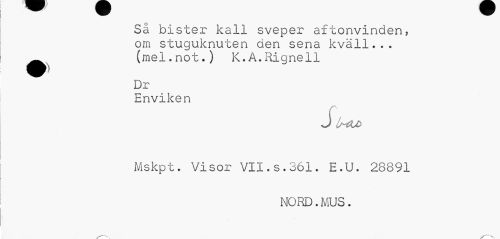 //// Så bister kall sveper aftonvinden, om stuguknuten den sena kväll... ^^ (mel.not.) K.Ä.Rignell //// Dr //// Enviken //// S lrtU> //// Mskpt. Visor VII.s.361. E.U. 28891 //// NORD.MUS. ////