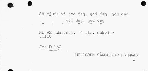 //// Så bjuda vi god dag, god dag, god dag //// god dag, god dag //// n ii ti n ii ii ii //// Nr 92 Mel.not. 4 str. emkväde //// s.119 //// Jfr D 137 //// HELLGREN SÅNGLEKAR FR.NÄÄS //// I ////