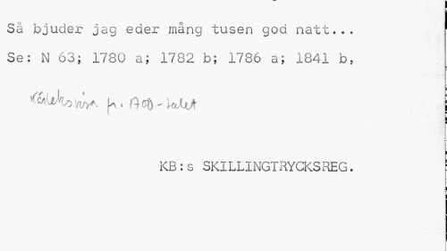 //// Så bjuder jag eder mång tusen god natt... ^ //// Se: N 63; 1780 a; 1782 b; 1786 a; 1841 b, //// ^AoVt/y* jA( ftcö-kJU/ | //// i //// I //// KB:s SKILLINGTRYCKSREG. ! ////