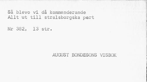 //// Så blevo vi då kommenderande Allt ut till stralsborgska pert //// i //// Nr 382, 13 str. //// i //// AUGUST BONDESONS VISBOK l //// U //// i ////