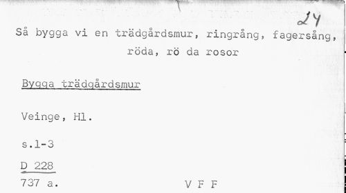//// of V //// Sa bygga vi en trädgårdsmur, ringrång, fagersång, //// röda, rö da rosor //// Bygga trädgårdsmur //// Veinge, Hl. s.1-3 //// D 228 j //// 737 a. V F F j ////