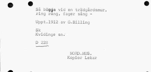 //// Så bö§ga vid en trädgårdsmur, ring rang, fager sång - //// Uppt.1912.av G.Billing Sk //// Kvidinge sn. //// D 228 //// NORD.MUS. Kopior Lekar ////