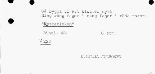 //// Så bygga vi ett kloster nytt //// Ring rang fager I sang fager i röda rosor. //// ^ "B&sterleken" //// Ringl. 48. 8 str. //// 1) 228 //// N.LILJA JULBOKEN //// /—••x --X ////