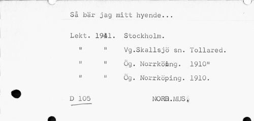 //// Så bär jag mitt hyende... //// Lekt. 1941. Stockholm. //// " " Vg.Skallsjö sn. Tollared. //// " « ög. Norrkömng. 1910» //// " 11 Ög. Norrköping. 1910. //// ® D 105 NORB.MUS§ ////