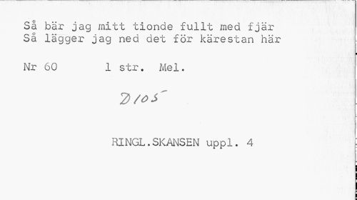 //// Så bär jag mitt tionde fullt med fjär Så lägger* jag ned det för kärestan här //// ¦ //// Nr 60 I str. Mel. //// 2/os' //// _ //// RINGL.SKANSEN uppl. 4 ////
