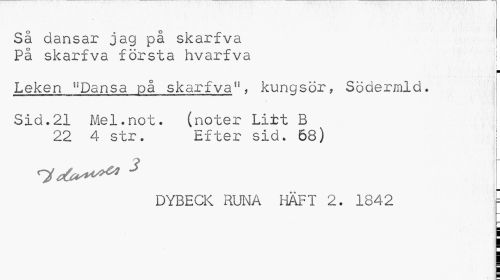 //// Så dansar jag på skarfva //// På skarfva första hvarfva I //// ¦ //// Leken "Dansa på skarfva", kungsör, Södermld. //// Sid.21 Mel.not. (noter Litt B 22 4 str. Efter sid. 68) //// j //// ^^^ 3 //// DYBECK RUNA HÄFT 2. 1842 f ////