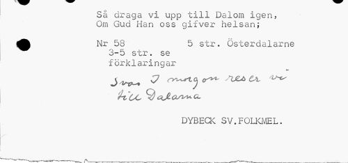 //// Så draga vi upp till Dalom igen, //// Om Gud Han oss gifver helsan; //// • « * //// Nr 58 5 str. Gsterdalarne //// 3-5 str. se förklaringar //// ,7 rxi^-ta AJU> CA- //// $-tCC 9cjlcw-c*- //// DYBECK SV.FOLKMEL. ////