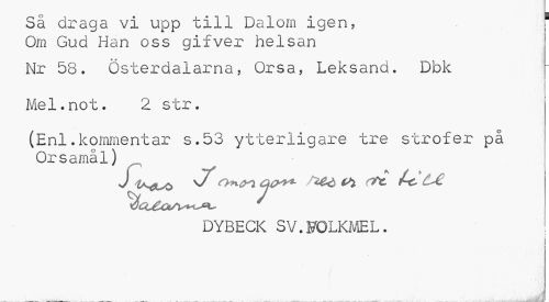//// Sä draga vi upp till Dalom igen, Om Gud Han oss gifver helsan //// Nr 58. Österdalarna, Orsa, Leksand. Dbk Mel.not. 2 str. //// (Enl.kommentar s.53 ytterligare tre strofer på Or s amå1) //// j iA^uo v/ cuyy*- /ie& etc & //// DYBECK SV.FÖLKMEL. //// i ////