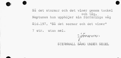 //// Sä det stormar och det viner genom tackel //// och tåg, //// Neptunus han upphöjer sin förfärliga våg Sid.197, nSå det sormar och det vineru 7 str. utan mel. //// i //// $jCOMt/rtns* //// STERNWALL SANG UNDER SEGEL ////