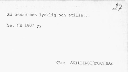 //// Så ensam men lycklig och stilla... Se; LE 1907 yy //// KB:s SKILLINGTRYCKSREG. ////