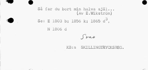 //// Så far du bort min halva själ... //// (Av E.Wikström) //// 10 . Se: E 1303 b; 1856 k; 1865 d3, //// N 1806 d //// KB:s SKILLINGTRYCKS REG. ////