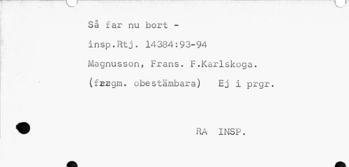 //// Så far nu bort -insp.Rtj. 14384:93-94 Magnusson, Frans. F.Karlskoga, (fssgm. obestämbara) Ej i prgr. //// 9 RA INSP. ////