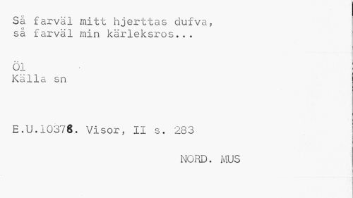//// Sä farväl mitt hjerttas dufva, //// sä farväl min kärleksros... //// * * //// 01 //// Källa sn //// E.U.10376. Visor, II s. 283 //// NORD. MUS //// • '¦! ////