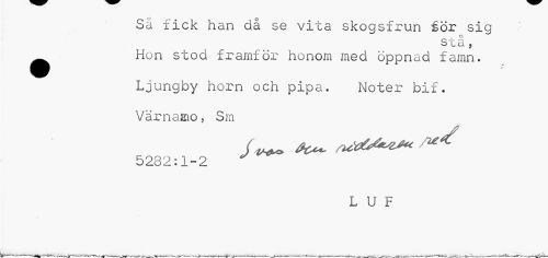 //// Sä fick han då se vita skogsfrun éör sig //// c+å //// o l a , //// • Hon stod framför honom med öppnad famn. //// i*. ^ //// Ljungby horn och pipa. Noter bif. Värnamo, Sm //// 5282:1-2 ' //// L U F ////