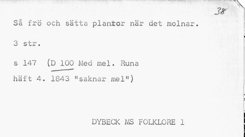 //// Jer //// Så frö och sätta plantor när det moinar. ! //// I //// • i //// i f //// 3 str. | //// s 147 (D 100 Med mel. Runa haft 4. 1843 "saknar mel") //// ¦ //// DYBECK MS FOLKLORE 1 j ////