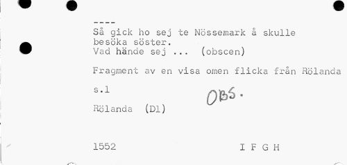 //// Så gick ho sej te Nössemark å skulle //// •besöka söster. //// Vad hände sej ..• (obscen) //// Fragment av en visa omen flicka från Rölanda //// Rolanda (Dl) ^ ' //// 1552 I F G H ////
