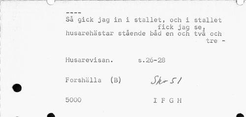 //// Så gick jag in i stallet? och i stallet //// ofick jag se, husarehästar stående båd en och två och //// tre - //// Husarevisan. s.26-28 //// Forshälla (B) Sjts^ S"/ //// 5000 I F G H ////
