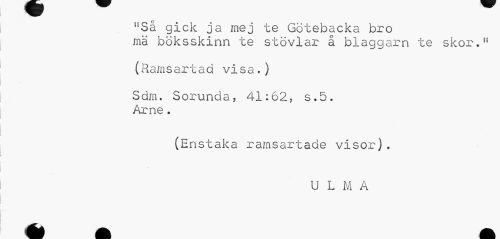 //// nSå gick ja mej te Götebacka bro mä böksskinn te stövlar å blaggarn te skor.n //// (Ramsartad visa.) //// Sdm. Sorunda, 41:62, s.5. Arne. //// (Enstaka ramsartade visor). //// U L M A ////
