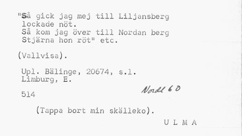 //// ,?5å gick jag mej till Liljansberg lockade nöt. //// Så kom jag över till Nordan berg Stjärna hon röt" etc. //// (Vallvisa). //// Upl. Bälinge, 20674, s.l. Limburg, E. //// 514 ^ //// (lappa bort min skalleko). ; //// U L M A ////