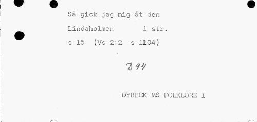 //// Så gick jag mig åt den Lindaholmen 1 str. //// ^ s 15 (Vs 2:2 s 1104) //// \ //// DYBECK MS FOLKLORE 1 ////