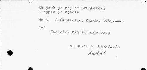 //// Så jekk ja maj åt Brugkebärj å rQpte ja kpsöta //// Nr 61 C.Östergtld, Kinda, Östg.lmf. Jrnf //// Jag gick mig åt höga bärg //// NORDLANDER BARNVISOR //// % rfaMé/ ////