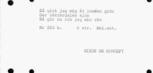 //// Så gick jag mig åt lunden grön Der näktergalen sjön Så gör du och jag min vän //// Nr 293 b. 6 str. Mel.not. //// WIEDE MS KONCEPT ////