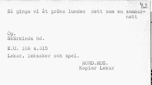 //// "7 foc //// Sä gingo vi åt gröna lunden dett som en sommar- i //// natt //// ¦ //// Ög. //// Skärkinds hd. //// E.U. 106 s.315 //// Lekar, leksaker och spel. //// NORD.MUS. //// Kopior Lekar = ////