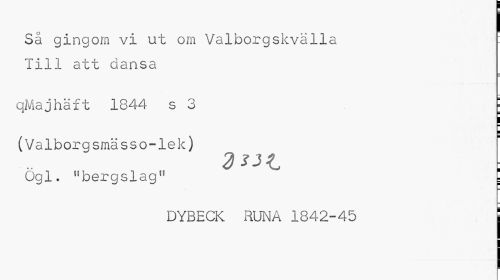 //// Så gingom vi ut om Valborgskvälla : //// Till att dansa //// qMajhäft 1844 s 3 ! //// (Valborgsmässo-lek) Ogl. "bergslag" //// DYBECK RUNA 1342-45 ////