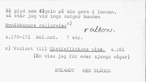 //// Så glad som fågeln på sin gren i lunden, så står jag vid inga sorger bunden //// x) //// Nynäsbanans rallarviaa / //// K cUJternj. //// s.170-171 Mel.not. 7 str. //// x) Variant till Gästisflickans visa. s.181 //// (En visa jag för eder sjunga vågar) //// BRIANDT MED SLÄGGA ////